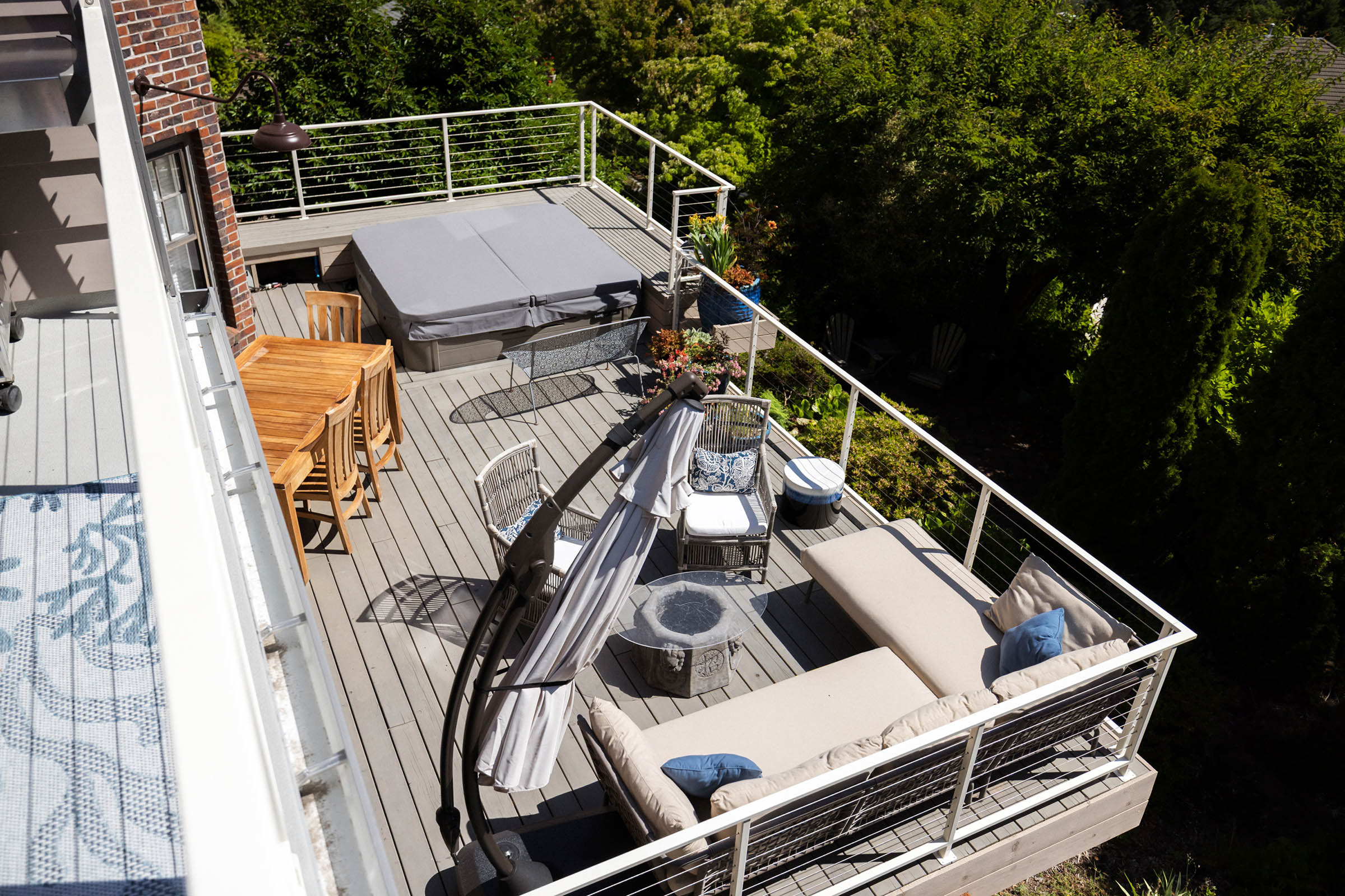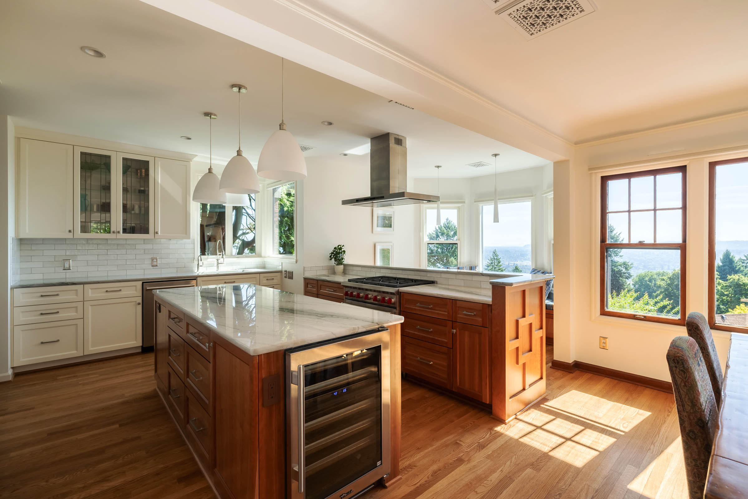 This hillside gem sits on a steep lot with pristine views. Additional outdoor balconies were just what this home needed to soak in the picture-perfect snapshot of Mt. Hood. On the lower level we added 400-square-feet of decking made from Northwest sustainable cedar, and on the main floor we doubled the original deck size to accommodate an outdoor cooking area. We upgraded the modest kitchen to an expansive open-concept design with quartz countertops, a 6-burner stove, and an open-shelved pantry made of cherry wood. Custom details add to the uniqueness of this home with designer ventilation covers and welded indoor stairwell railings.